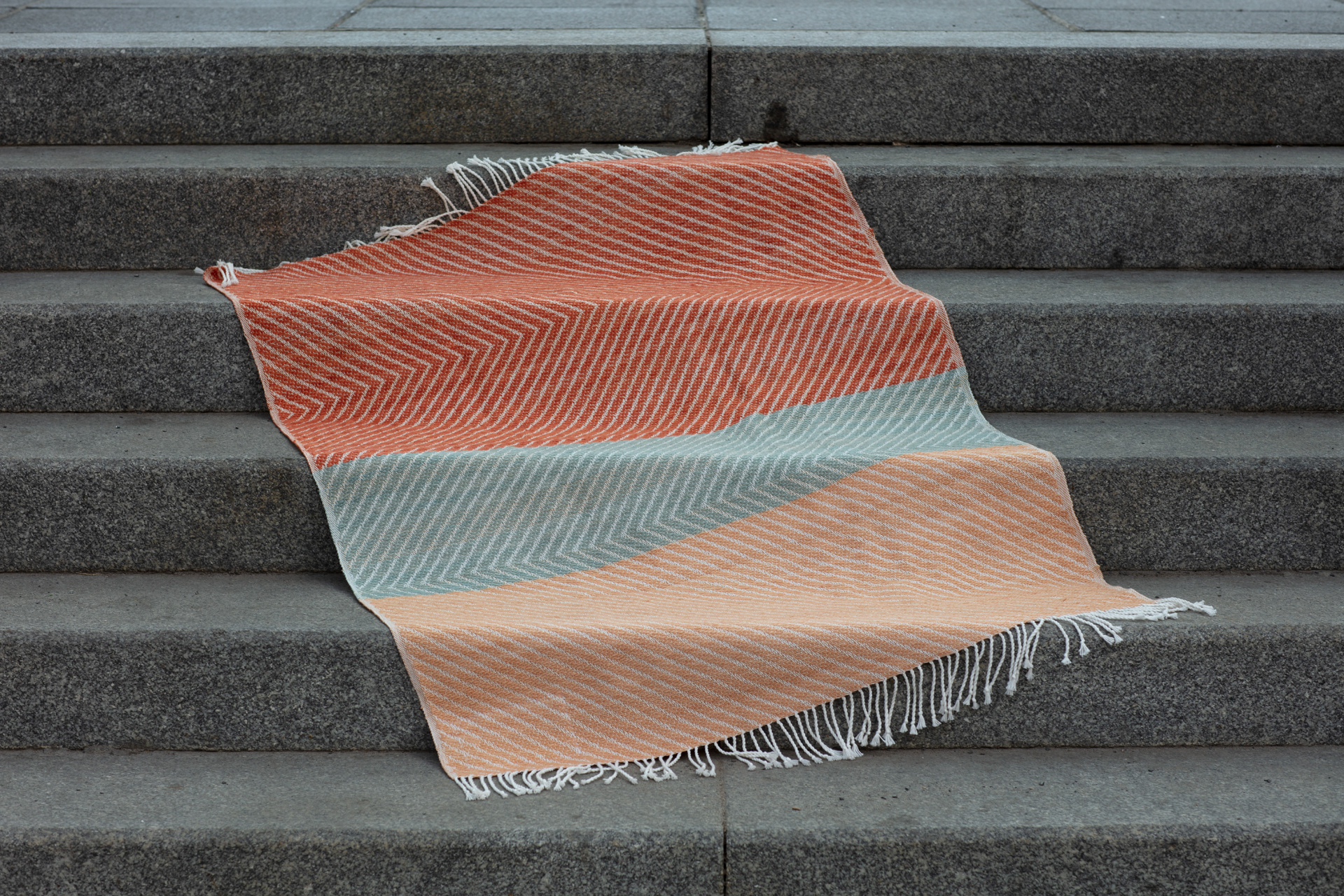 Tissage sur métier à 20 lames et sur métier Jacquard (étiquette). Teinture naturelle de garance, bleu de Saxe et bois d’arc sur laine Mérinos. Franges retordues à la main.